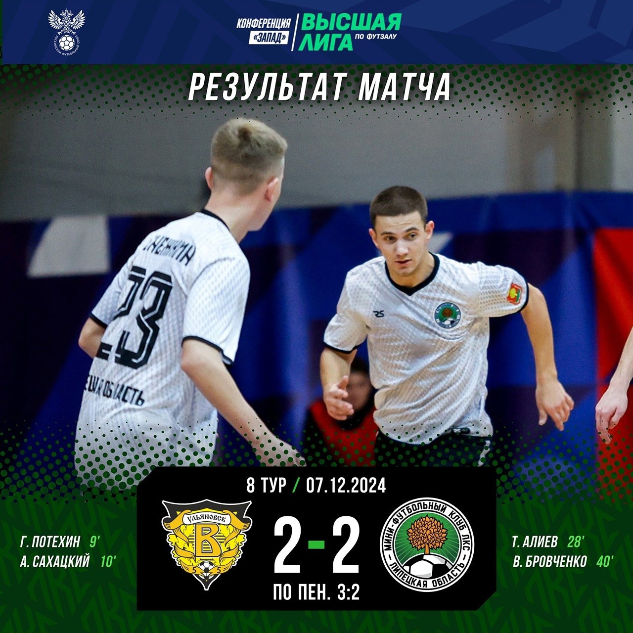 Серия пенальти: Размик Хачатрян — 0:1, Иван Андреев — 1:1, Тимур Алиев — 1:1, Александр Сахацкий — 2:1, Всеволод Сафонов — 2:1, Роман Аносов — 3:1, Алексей Головин — 3:2, Денис Родин — 3:2, Валерий Бровченко — 3:2.