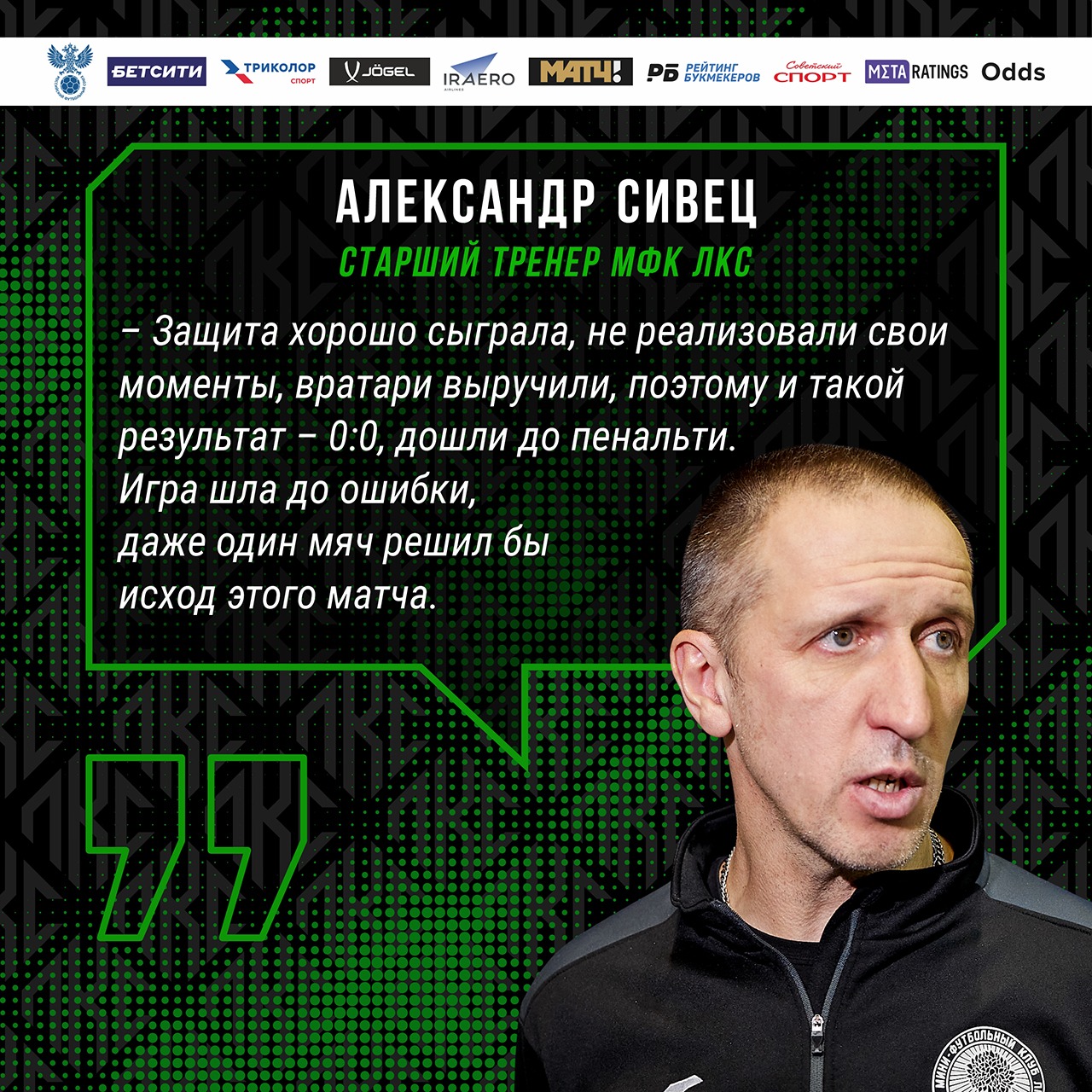 Старший тренер МФК ЛКС Александр Сивец прокомментировал результат первого матча с "ИрАэро":