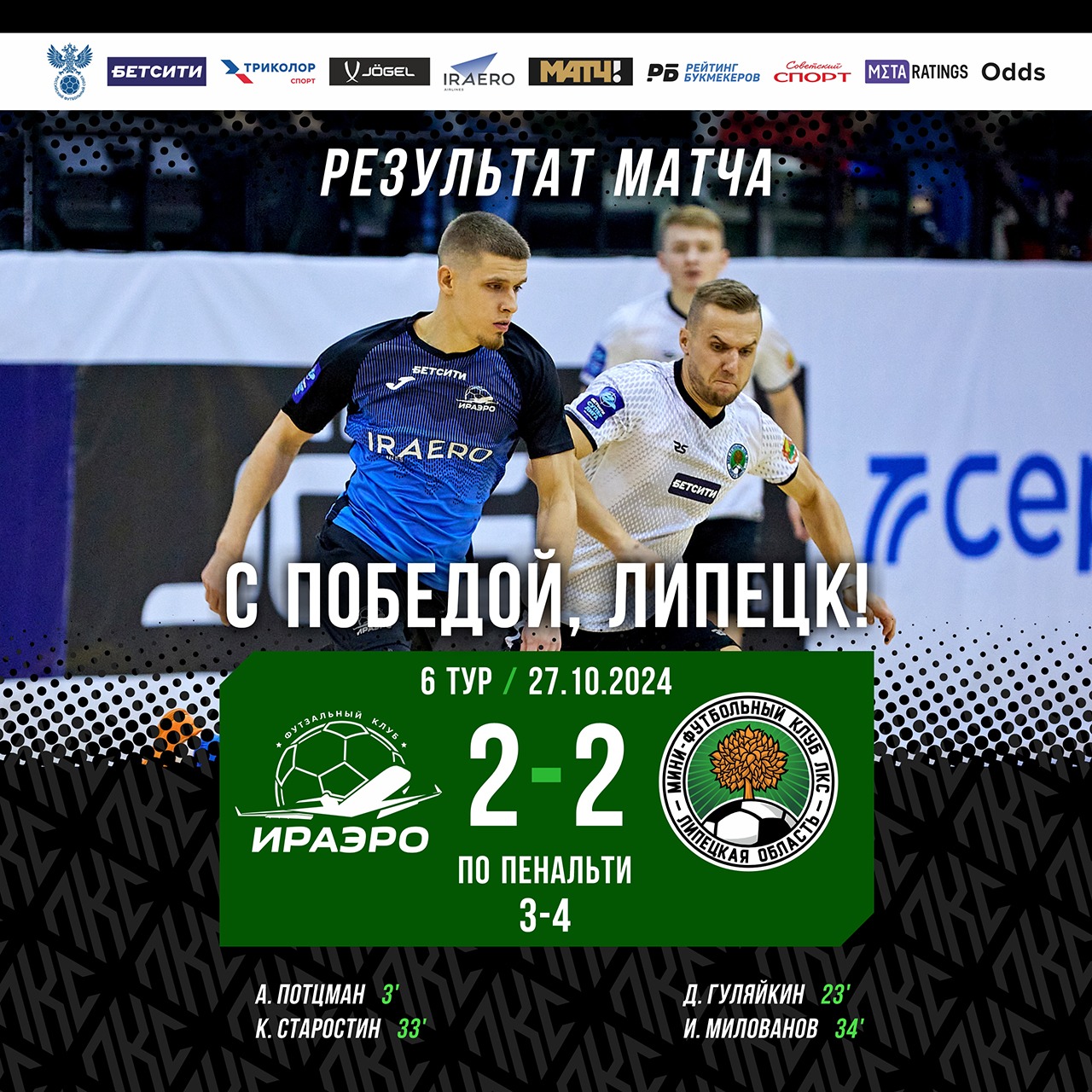 «Лётчикам» удался быстрый гол: уже на третьей минуте Рамба скинул мяч под удар Потцману, и тот переиграл Родиона Залалетдинова. Этот мяч так и остался единственным до перерыва. В дебюте второго тайма Денис Гуляйкин сравнял счёт, а когда Кирилл Старостин вновь вывел хозяев вперёд, липчанам хватило менее минуты, чтобы снова отыграться — Иван Милованов здорово пробил при розыгрыше углового. Как и накануне, дело дошло до пенальти, но на сей раз сильнее оказались гости, так что команды набрали в туре по три очка.